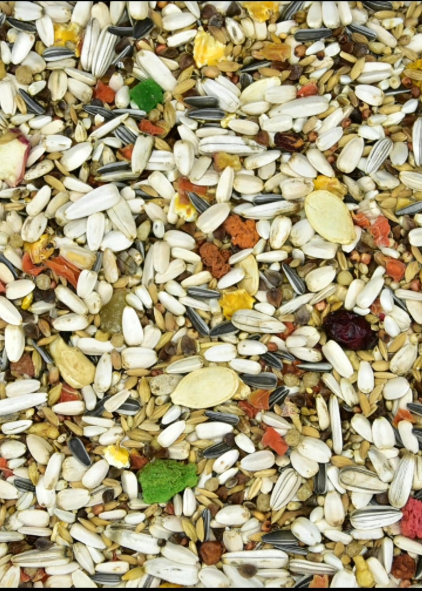 Složení: slunečnice bílá prémium 15%, kardi 12%, oves nahý 7,5%, pohanka 8%, semenec 6%, čirok bílý 5%, čirok červený 5%, slunečnice Kishwardy 5%, slunečnice Iryga 5%, pšenice extra 5%, ječmen 5%, kukuřičné lupínky 2,5%, rýže 2%, dýňová semínka 2%, sušené ovoce (papaja, mango, ananas) 5%, rozinka královská zlatá 2%, chipsy banánové 1%, jablko sušené 0,5%, ovoce golgu 0,5%, piniové a kešu oříšky 1%, mrkev sušená 1%, řepa sušená 1%, šipek 0,5%, přírodní extrudy 0,5%, vitamínový doplněk 1%, grit minerální 1%.